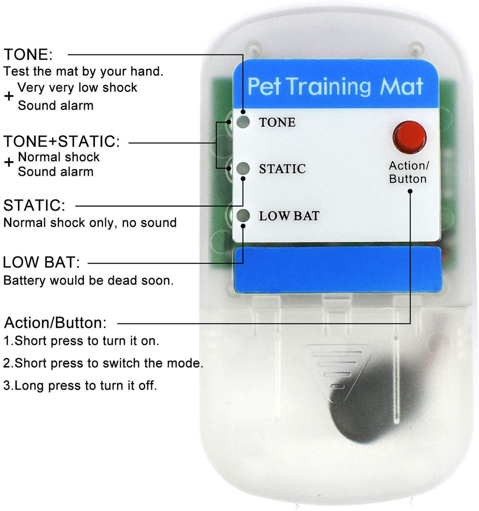 Versión actualizada con tres modos de trabajo (tono, tono + estático, estático), adecuado para la mayoría de perros y gatos de tamaño. Tono: alerta de sonido y descarga eléctrica muy baja, puedes probar la alfombrilla con tu mano en este modo. Tono + estático: alerta de sonido y descarga eléctrica normal. Estático: solo descarga eléctrica normal, sin alerta de sonido.