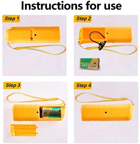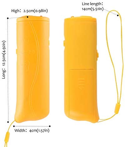 • Amplia cobertura: Lleva un rango ultrasónico de hasta 16.4 ft – capaz de enviar un mensaje a los perros antes de que se vuelvan agresivos (se requiere batería de 9 voltios/no incluida).