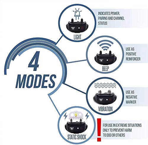 Gran visualización LCD remoto con impacto ajustable y 4 modos: 1 – 100 nivel de personalización para la estimulación estática y la vibración. También puede utilizar un tono (beep), modo que le dará una alerta audible. Tiene un diseño azul retroiluminada LCD para tanto de día como de noche. Ajuste de impacto solo recomendado en situaciones de emergencia y no se recomienda como una forma de entrenamiento de comportamiento positivo