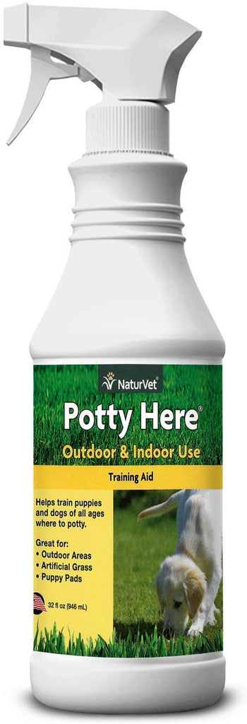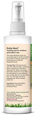 Potty Here Training Aid Spray helps train puppies and dogs of all ages where to potty.