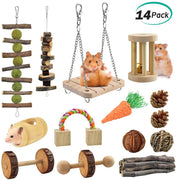 ERKOON - Juego de 14 juguetes para masticar hámster, rata, cobayas, chinchilla, accesorios para masticar, mancuernas de madera natural, con rodillos de cuidado de los dientes para conejos, pájaros, hámster, gerbil