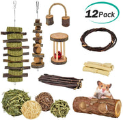 ERKOON New 12 Pack Hamster Chew Toys Gerbil Rat Guinea Pig Chinchilla Chew Toys Accessories, Natural Wooden Dumbbells Exercise Bell Roller Teeth Care Molar Toy for Rabbits Bird Rabbits Hamster Gerbil