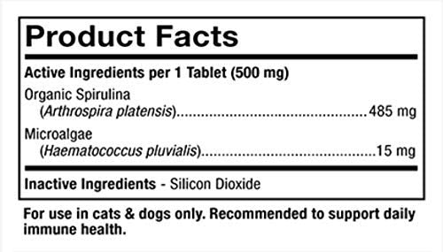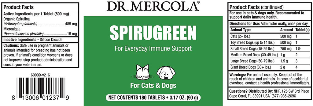 Dr. Mercola Spirugreen Superfood para mascotas – Ayuda a el sistema inmunológico – para gatos, perros, pájaros y los peces – contiene Espirulina y astaxanthin – 180 Tabletas