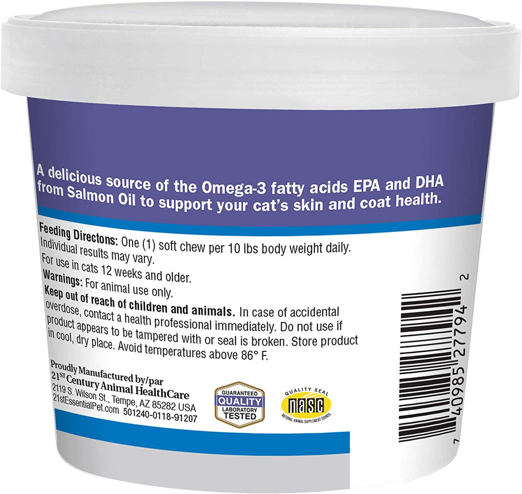Características: aceite de salmón de las aguas prístinas de Alaska, con ácidos grasos omega-3, EPA y DHA. Formulado en un masticado suave y sabroso.